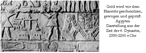 Mit der Erfindung des Blasebalgs etwa 2000 v.Chr. waren sie in der Lage, nahezu reines Gold zu gewinnen.
